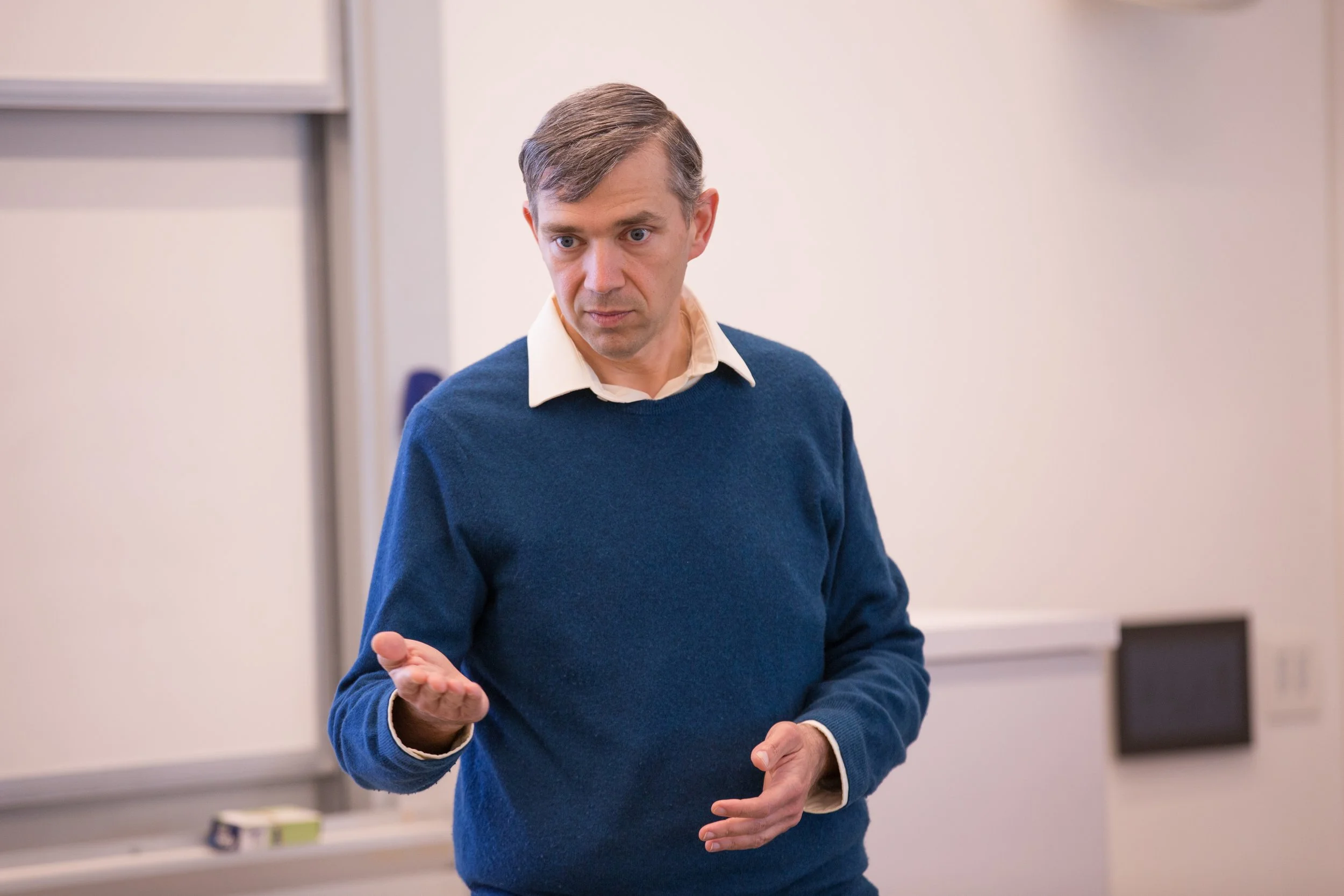 Photo by Elaine Zhang. Professor Anastasiu answering questions during a lecture.