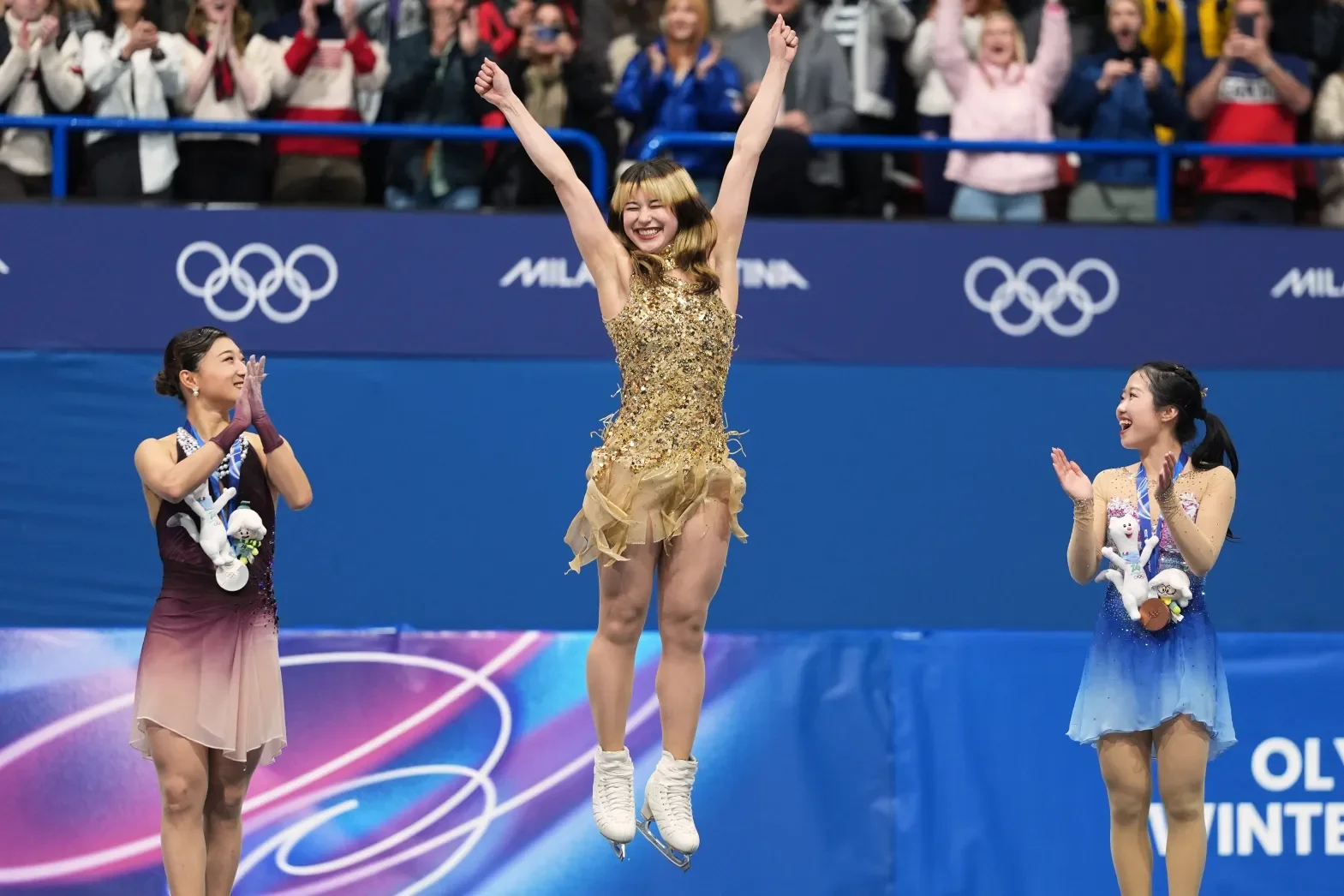 From left to right: silver medalist Kaori Sakamoto of Japan, gold medalist Alysa Liu of the United States, and bronze medalist Ami Nakai of Japan, jump on the podium to receive their medals after competing in the women's free skate program in figure skating at the 2026 Winter Olympics, in Milan, Italy, Thursday, Feb. 19, 2026. (AP Photo/Stephanie Scarbrough)