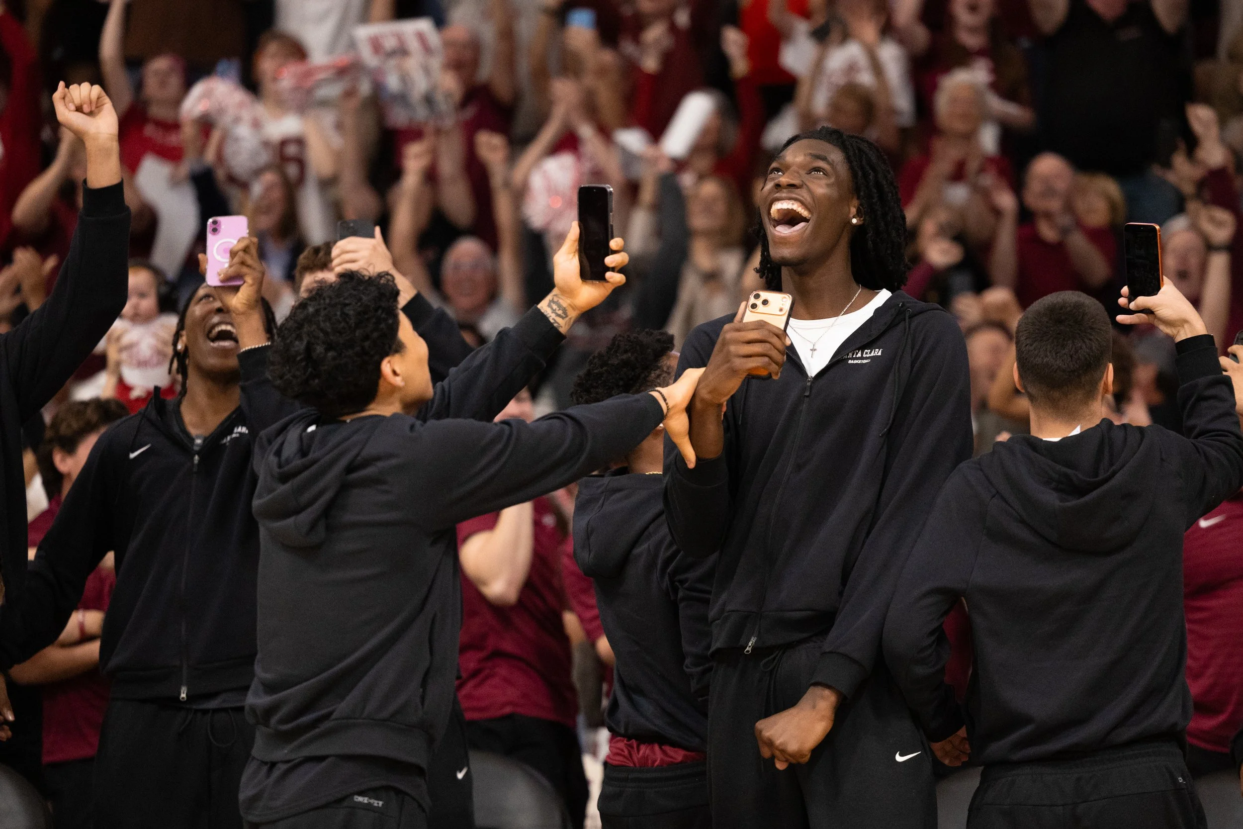 Bukky Oboye ’28 and the Santa Clara men’s basketball team react to hearing their team received an at-large bid to the 2026 NCAA Division I Men’s Basketball Tournament on March 15, 2026. (Nina Glick/The Santa Clara)