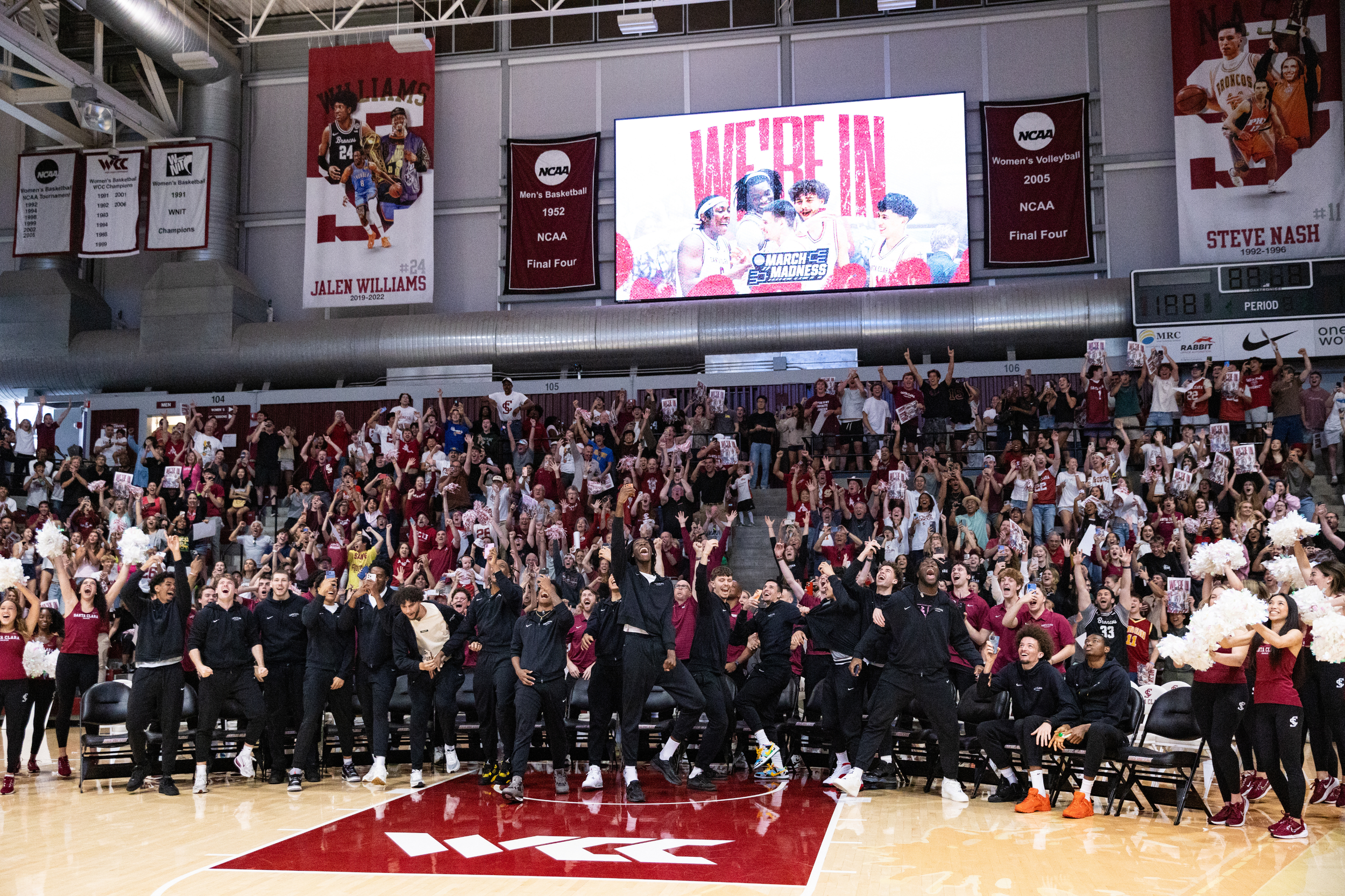 Santa Clara men’s basketball team and their fans react to hearing their team received an at-large bid to the 2026 NCAA Division I Men’s Basketball Tournament on March 15, 2026. (Nina Glick/The Santa Clara)