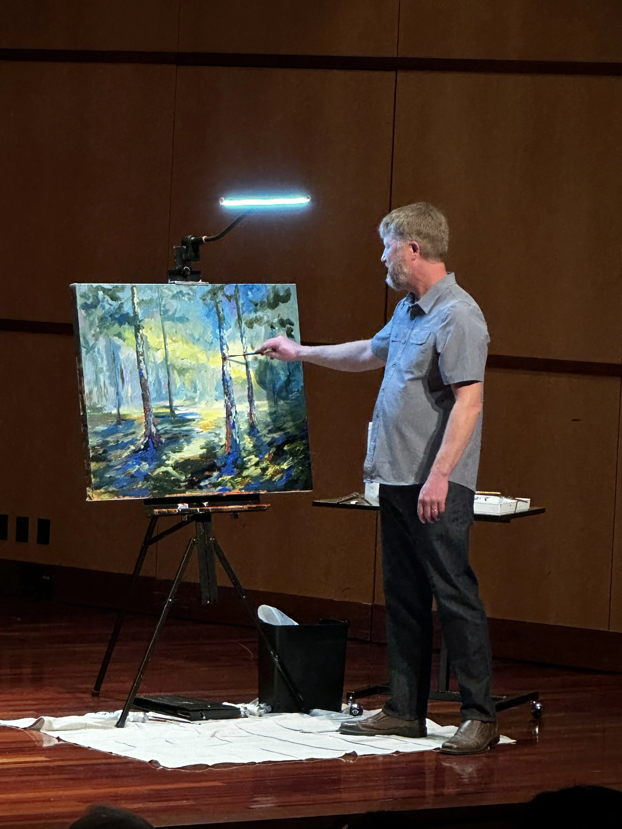 Mike Stevens, brother to beloved professor Bill Stevens, paints onstage while the trio performs. Photo by Ivy Wu