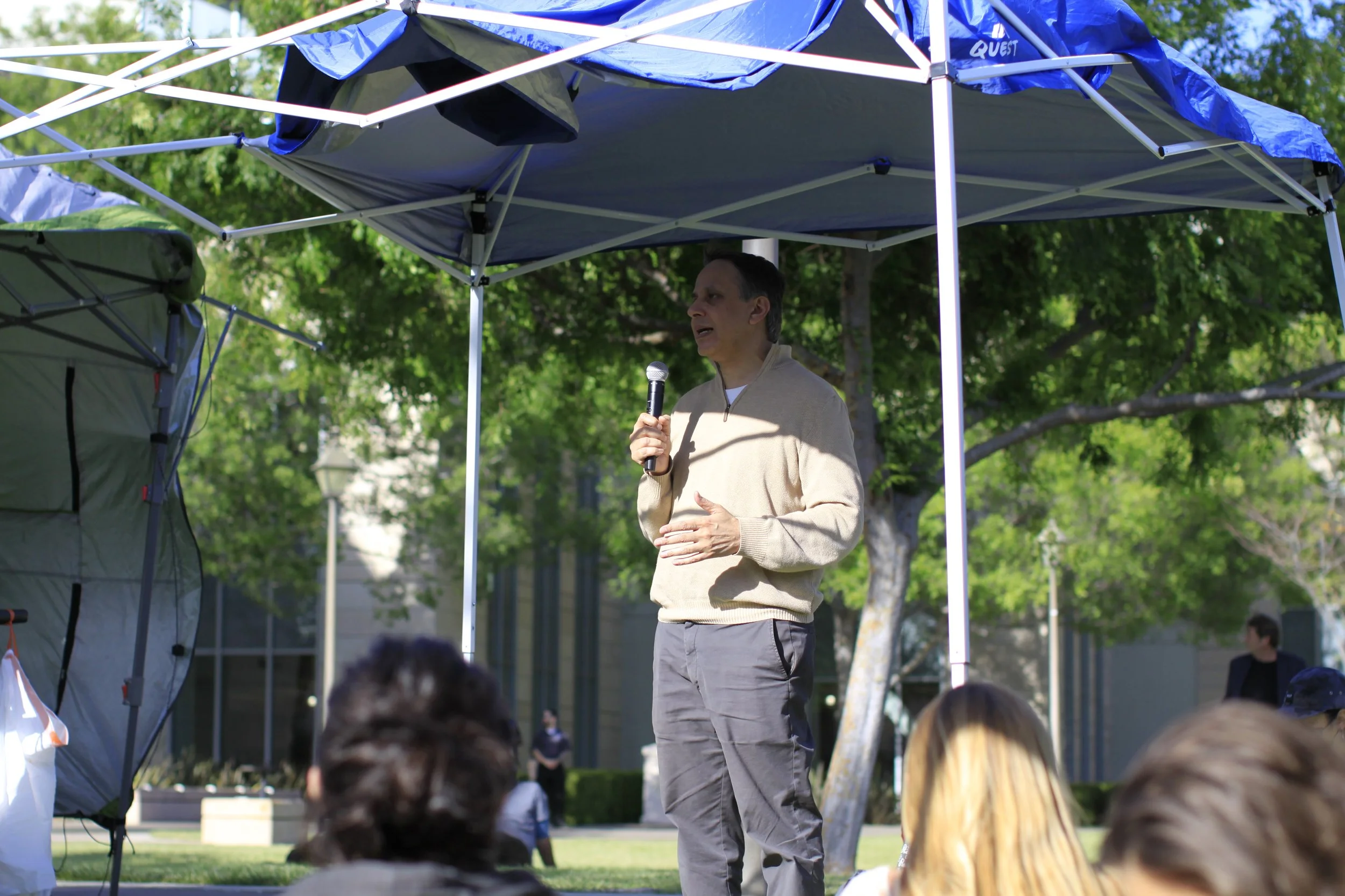 Over the course of eight hours, hundreds of faculty, staff and students spread out on blankets across Alameda Lawn, many wearing keffiyehs, reading, working and talking with the people around them in the shade of pop-up canopies. Prayers, poetry readings, impassioned speakers and a live oud performance captured the audience’s attention, as well as that of the many students passing the lawn on their way to and from classes.