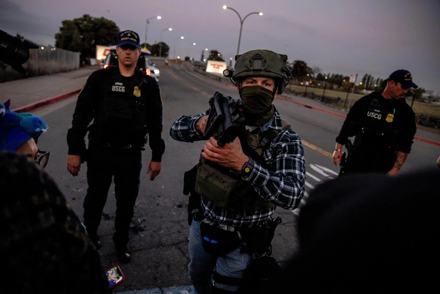A few hundred people, many singing hymns and carrying signs saying “No ICE or troops in the Bay,” referring to U.S. Immigration and Customs Enforcement, gathered shortly after dawn outside Coast Guard Island in Alameda. Police used at least one flash-bang grenade to clear a handful of demonstrators from the entrance as CBP vehicles drove through.