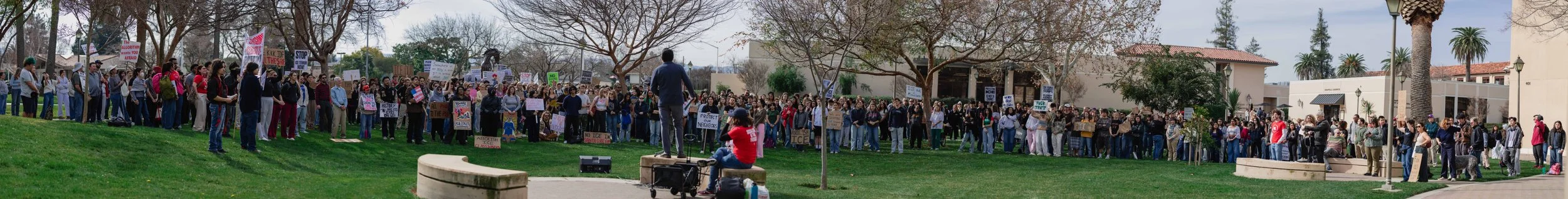 Hundreds of protestors gathered in front of the Bronco statue. (Dylan Ryu/The Santa Clara)