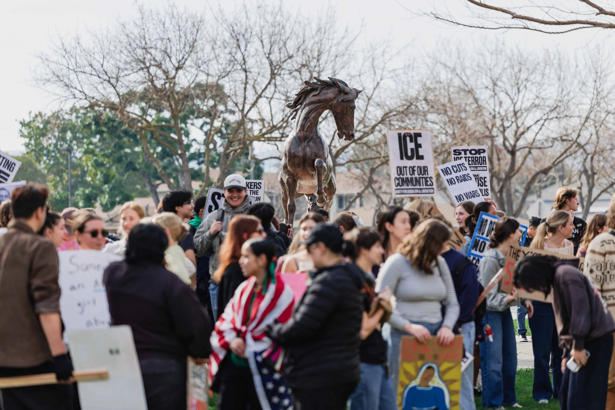 More than 600 Santa Clara University students gathered at the Bronco statue on Friday afternoon to join a nationwide day of action, marking one of the largest student protests the University has seen in years. The rally called for the removal of Immigration and Customs Enforcement from communities, following the fatal shootings of Alex Pretti and Renee Good by federal agents in Minneapolis earlier this month.