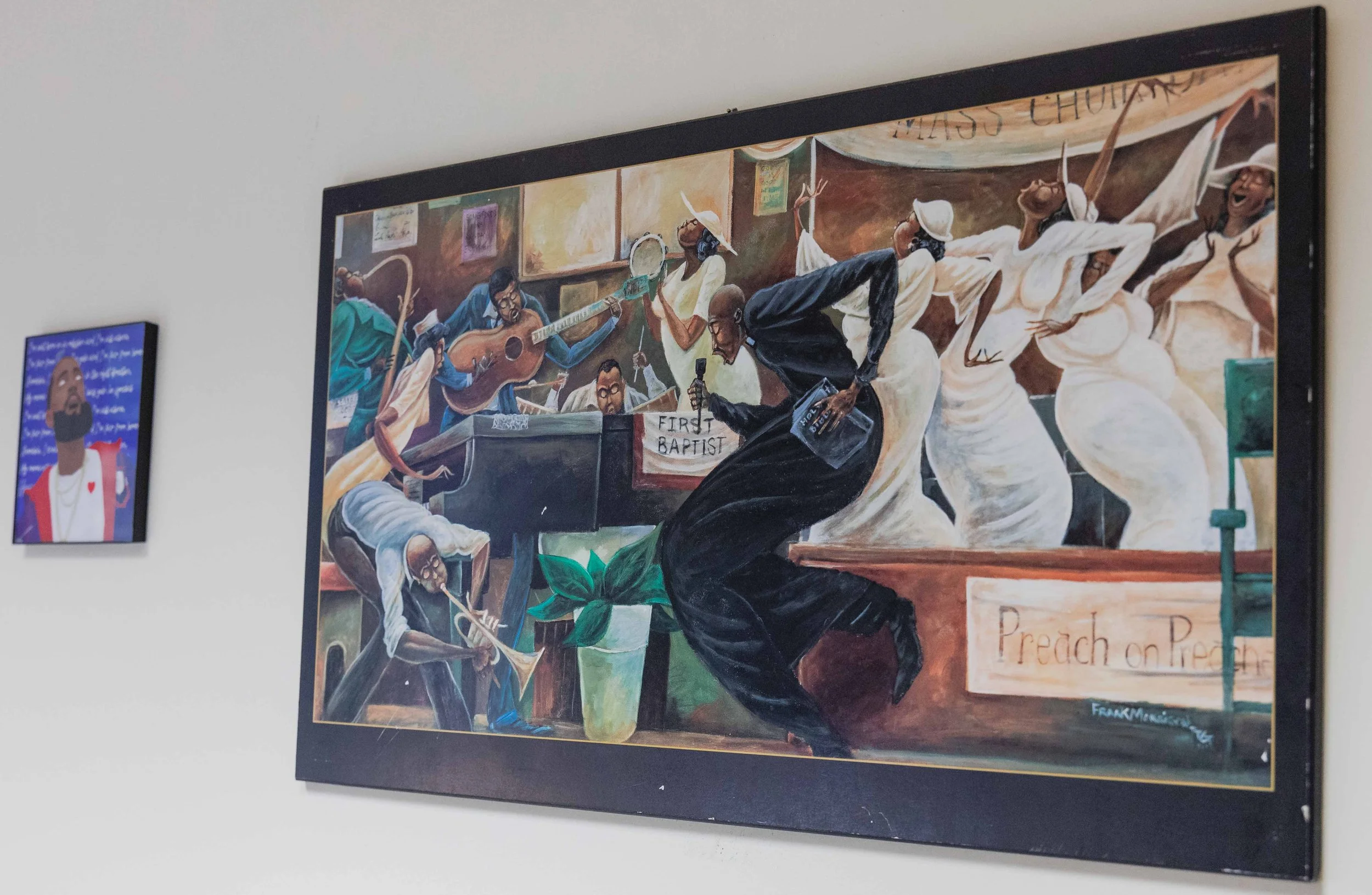 A copy of Frank Morrison’s “Preach on Preacher” hangs on White’s wall in his office. (Dylan Ryu/The Santa Clara)