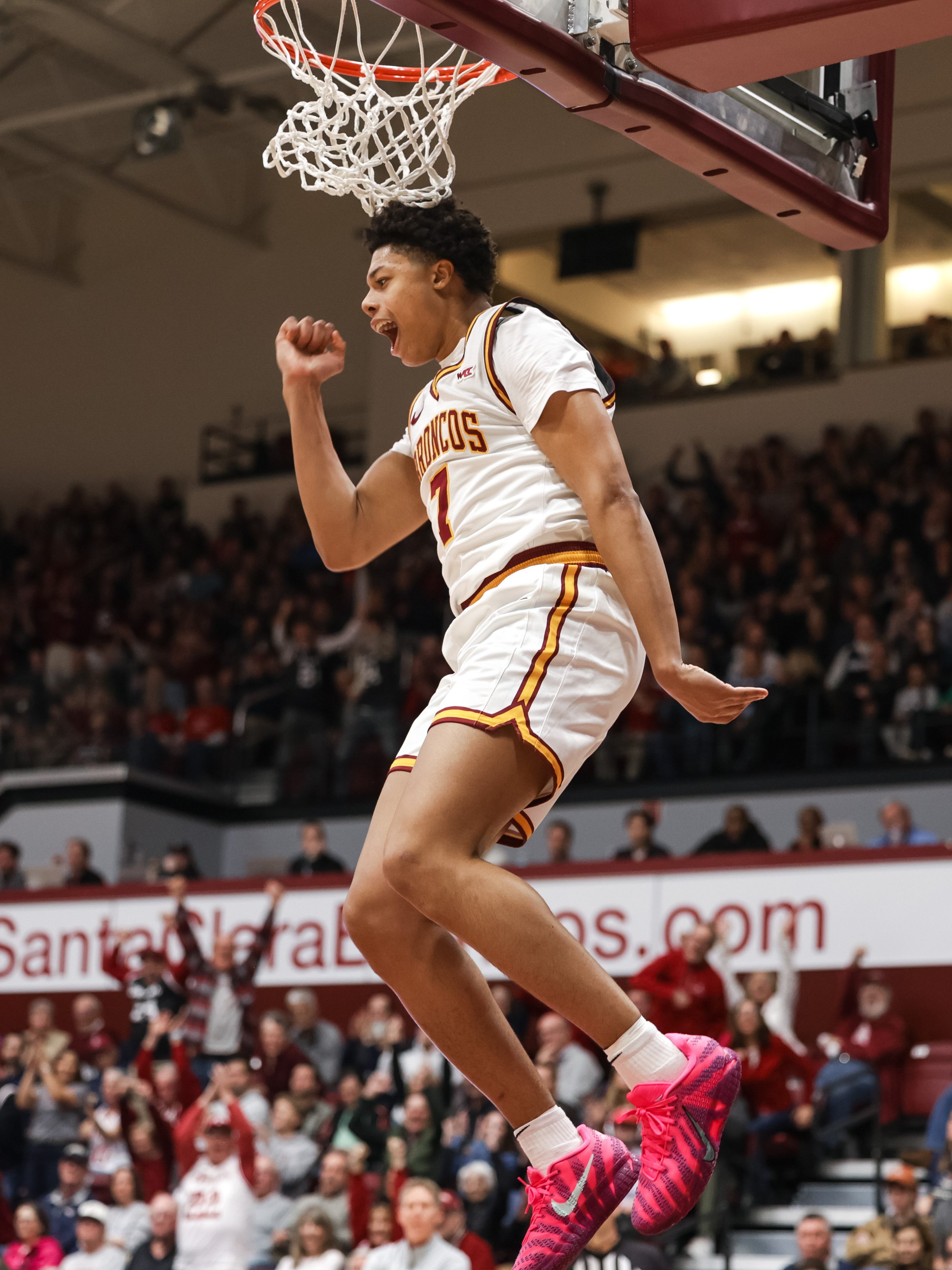 KJ Cochran ‘29 celebrates after a dunk that maintained the Bronco lead over Gonzaga during the first half of their game on Saturday, Feb. 14, 2026. (Nina Glick/The Santa Clara)