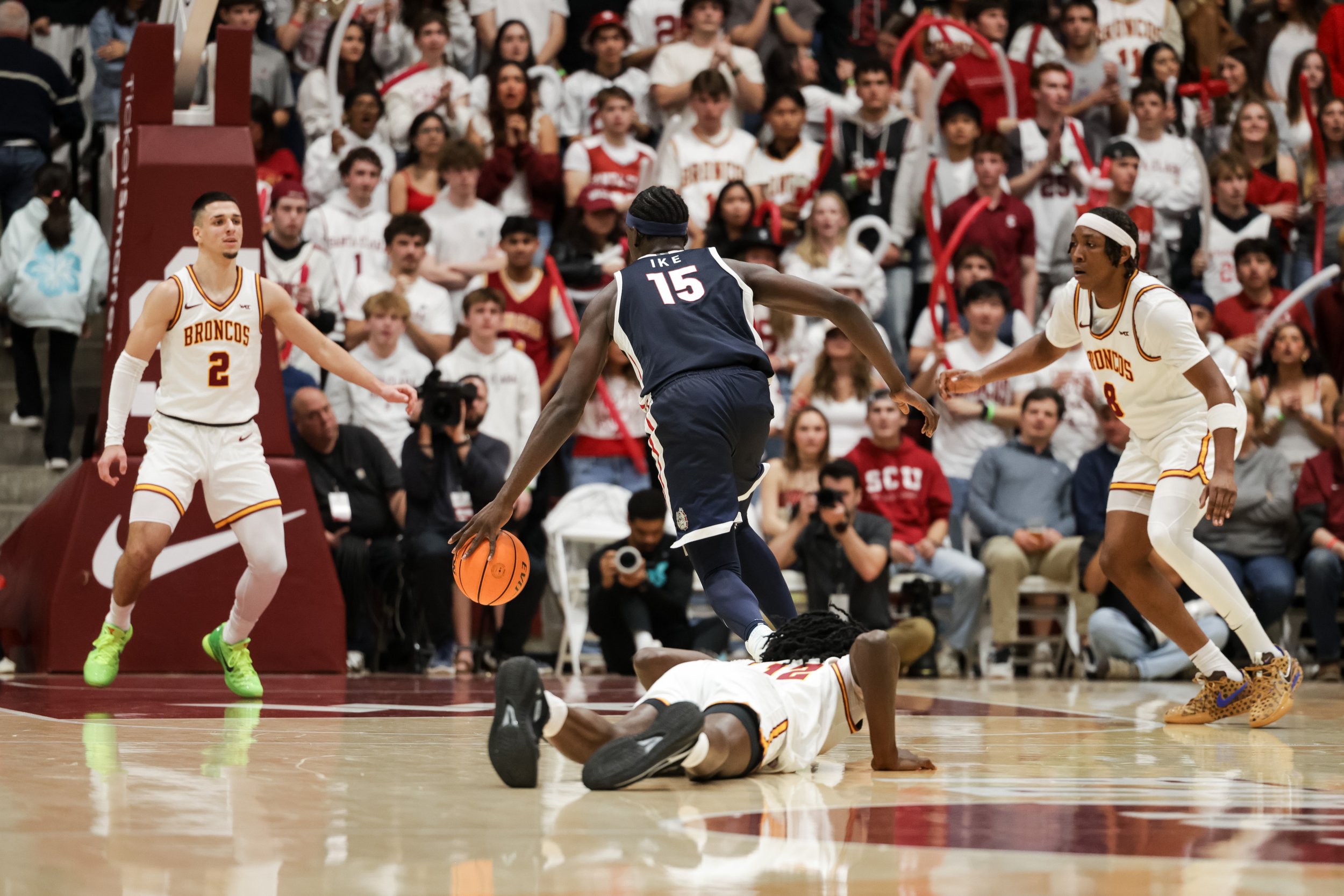 Santa Clara came out of halftime firing with a 5-0 run to retake the lead at 49-48. The lead went back and forth until back-to-back 3-point shots from Thierry Darlan ’27 and Sash Gavalyugov ’28 pushed the Broncos ahead 60-55 with just over 12 minutes remaining.