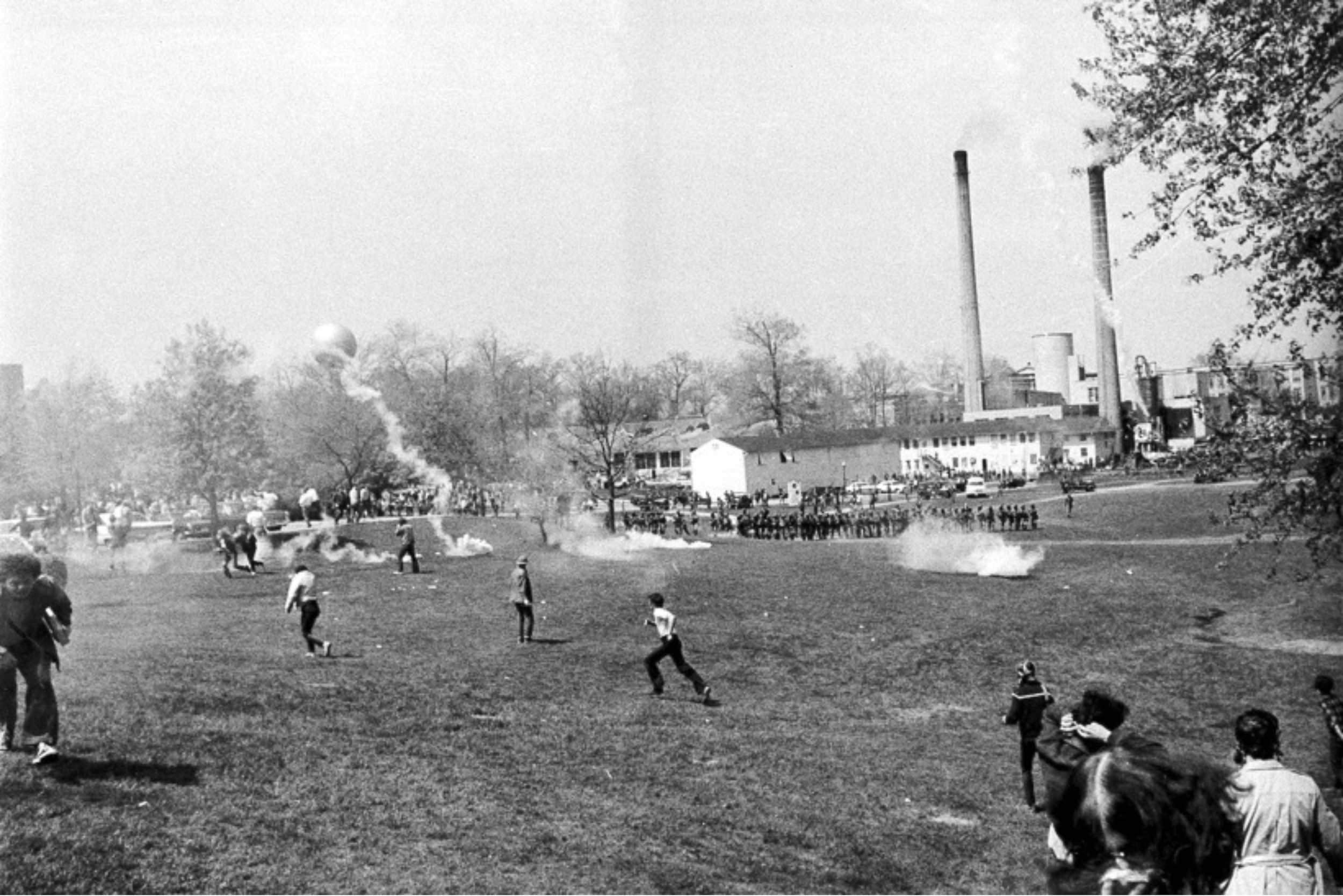 A general view shows tear gas and students during an anti-Vietnam war protest at Kent State University in Ohio on May 4, 1971. U.S. National Guardsmen opened fire during the protests, killing four students and wounding five. (AP Photo/Larry Stoddard, File)