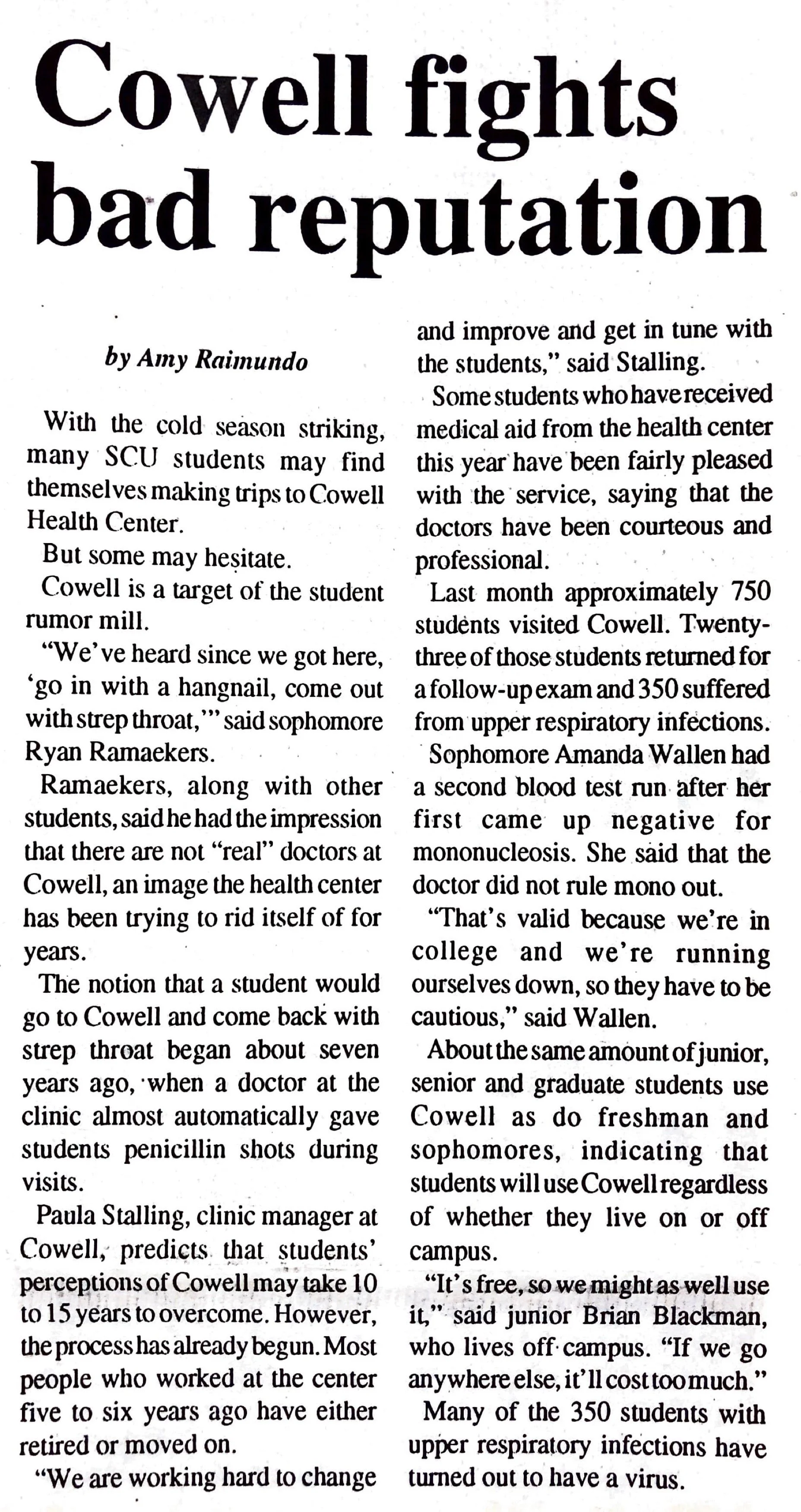 This news story was originally published in The Santa Clara on Nov. 19, 1992 and discusses student perceptions of Cowell Center.