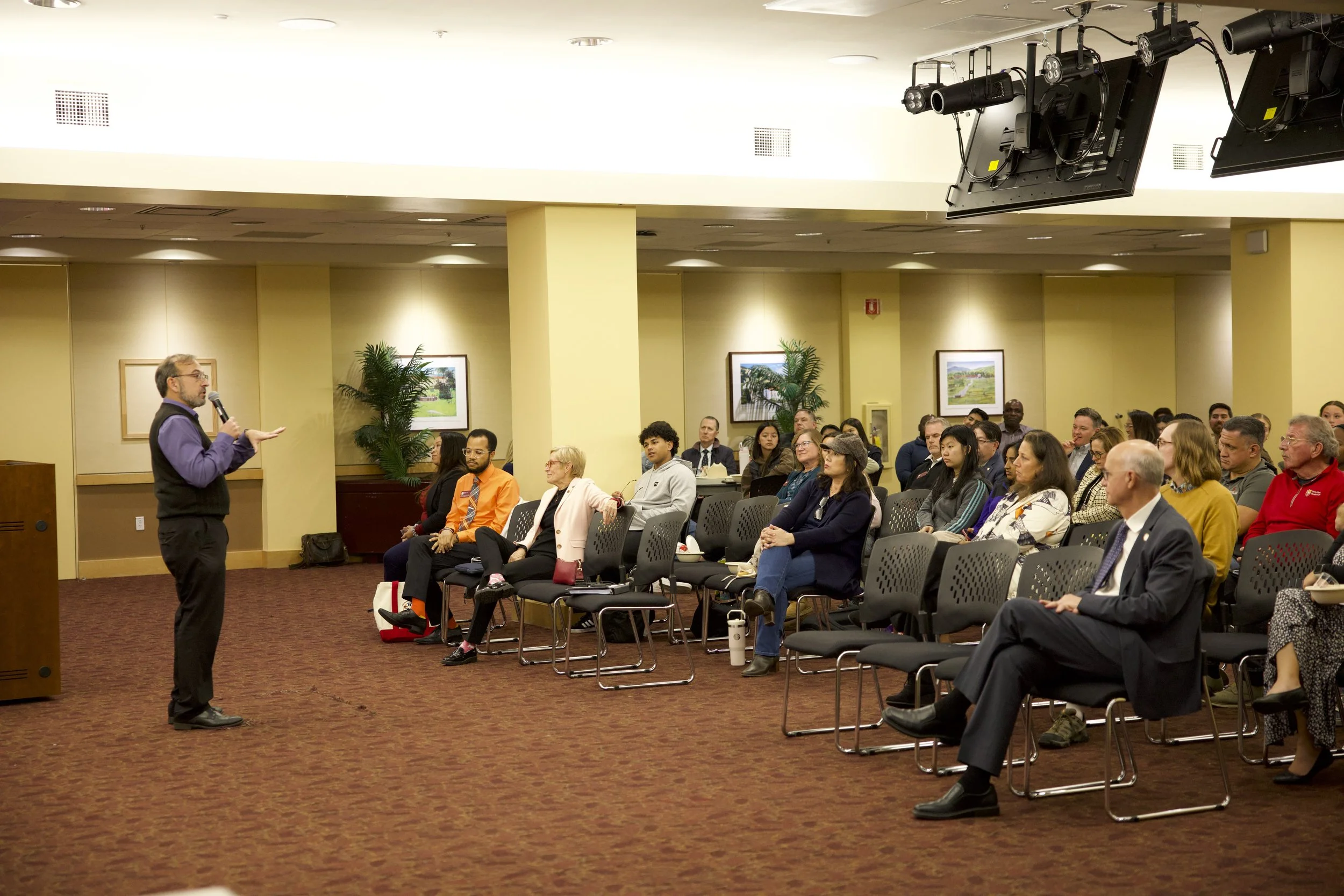 Ray Plaza, the director of the Office for Diversity and Inclusion, shares updates from the Spring 2025 Diversity Forum. (Nina Glick/The Santa Clara)