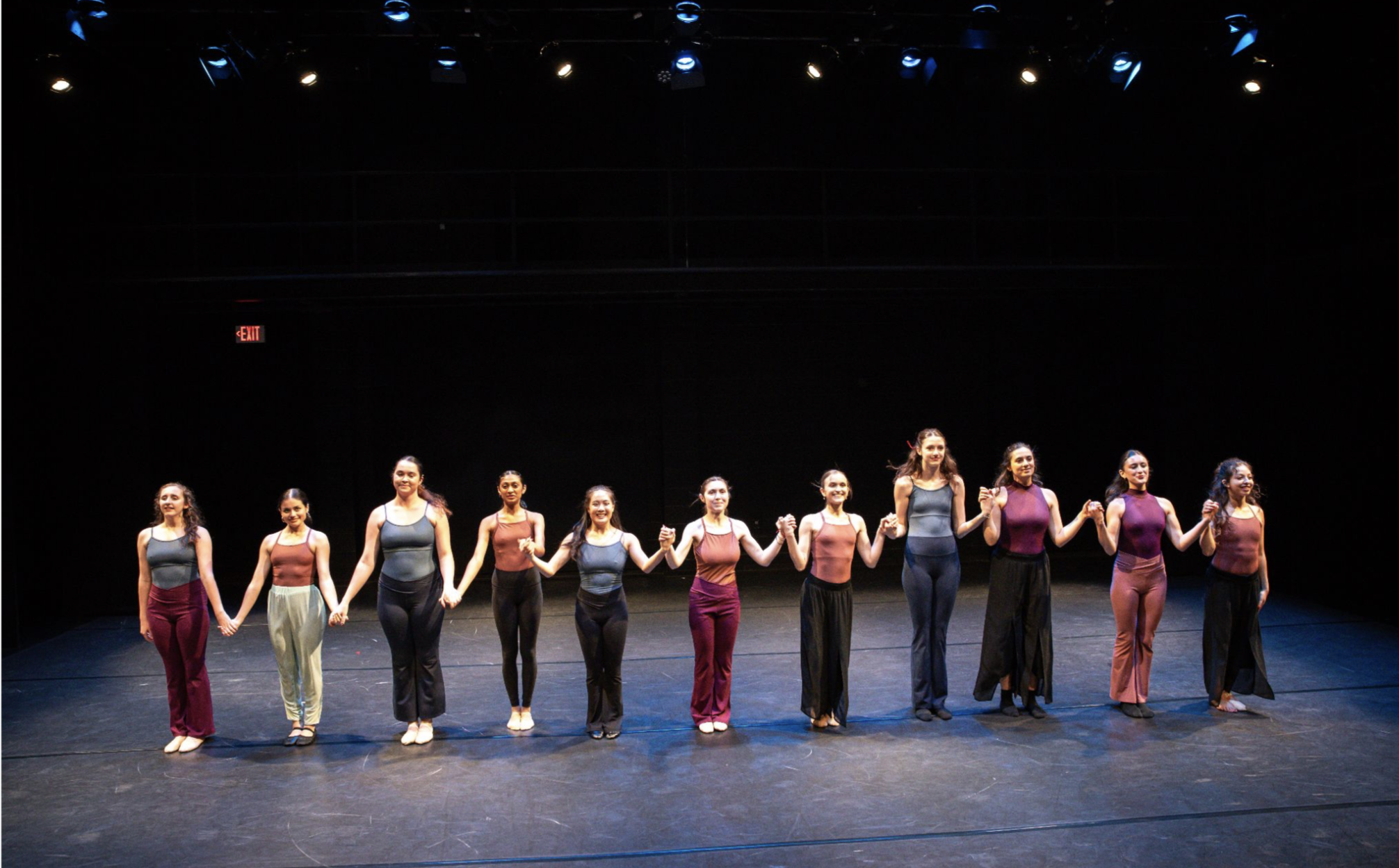 Dancers Annika Kayser, Gracie James-Hickey, Sophia Taylor, Advaitha Ekkirala, Megan Baldemor, Ximena De La Parra-Tostado, Kirby Maitra, Amelia Cole, Natalia Shaheen, Avalon Dela Rosa, and Kamyllue Gutierrez Arteaga taking their bow at Spring Dance Festival on Saturday Apr. 11, 2026. (Elaine Zhang/The Santa Clara)