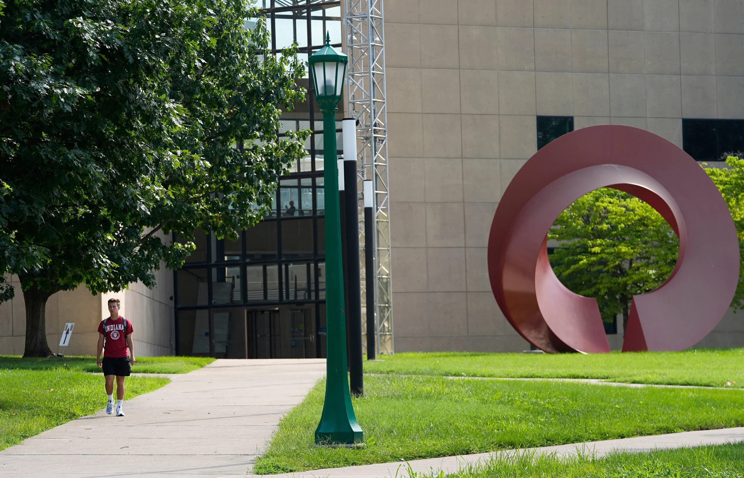 A guest walks on the campus of Indiana University, Thursday, July 17, 2025, in Bloomington, Ind. (AP Photo/Darron Cummings)