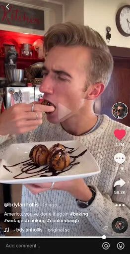 As he tests a deep-fried cookie dough recipe from 1971, Hollis makes funny statements such as “I fry with peanut oil...because it’s correct.” Hollis’s wholesome demeanor makes him loved by viewers, especially as his TikTok bio states “pull up a chair and stay a while :).” His dry humor and reaction to the success of the fried cookie dough balls can bring a smile to any viewer's face.
