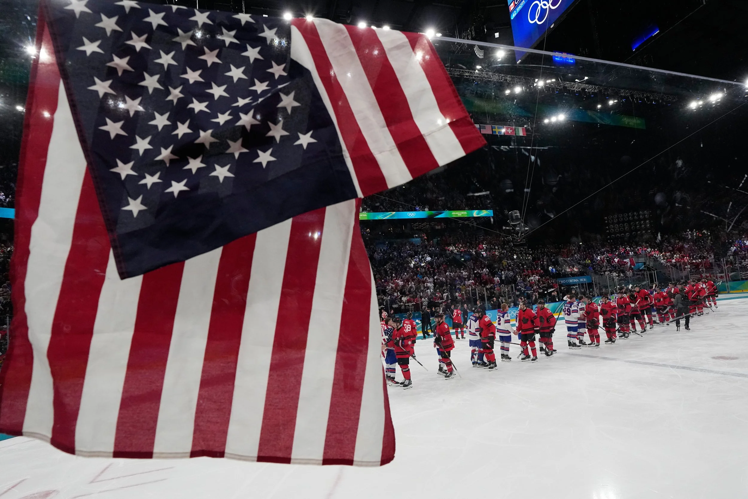 United States and Canada players shake hands after a men’s ice hockey gold medal game between Canada and the United States at the 2026 Winter Olympics, in Milan, Italy, Sunday, Feb. 22, 2026. (AP Photo/Petr David Josek)