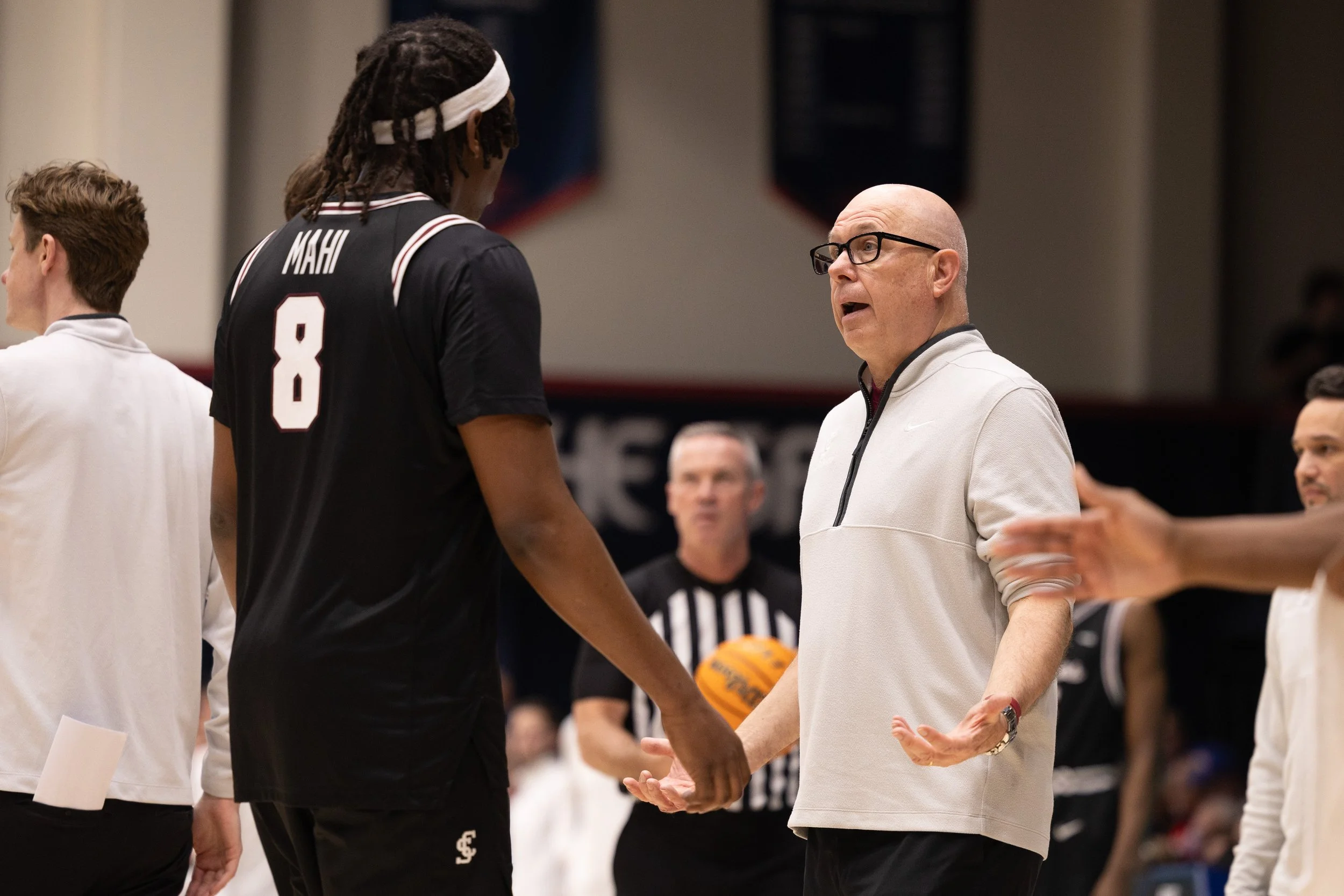 Santa Clara men’s basketball coach Herb Sendek questions Elijah Mahi ’26 (8) during the second half of Santa Clara men’s basketball’s game against Saint Mary’s. (Nina Glick/The Santa Clara)