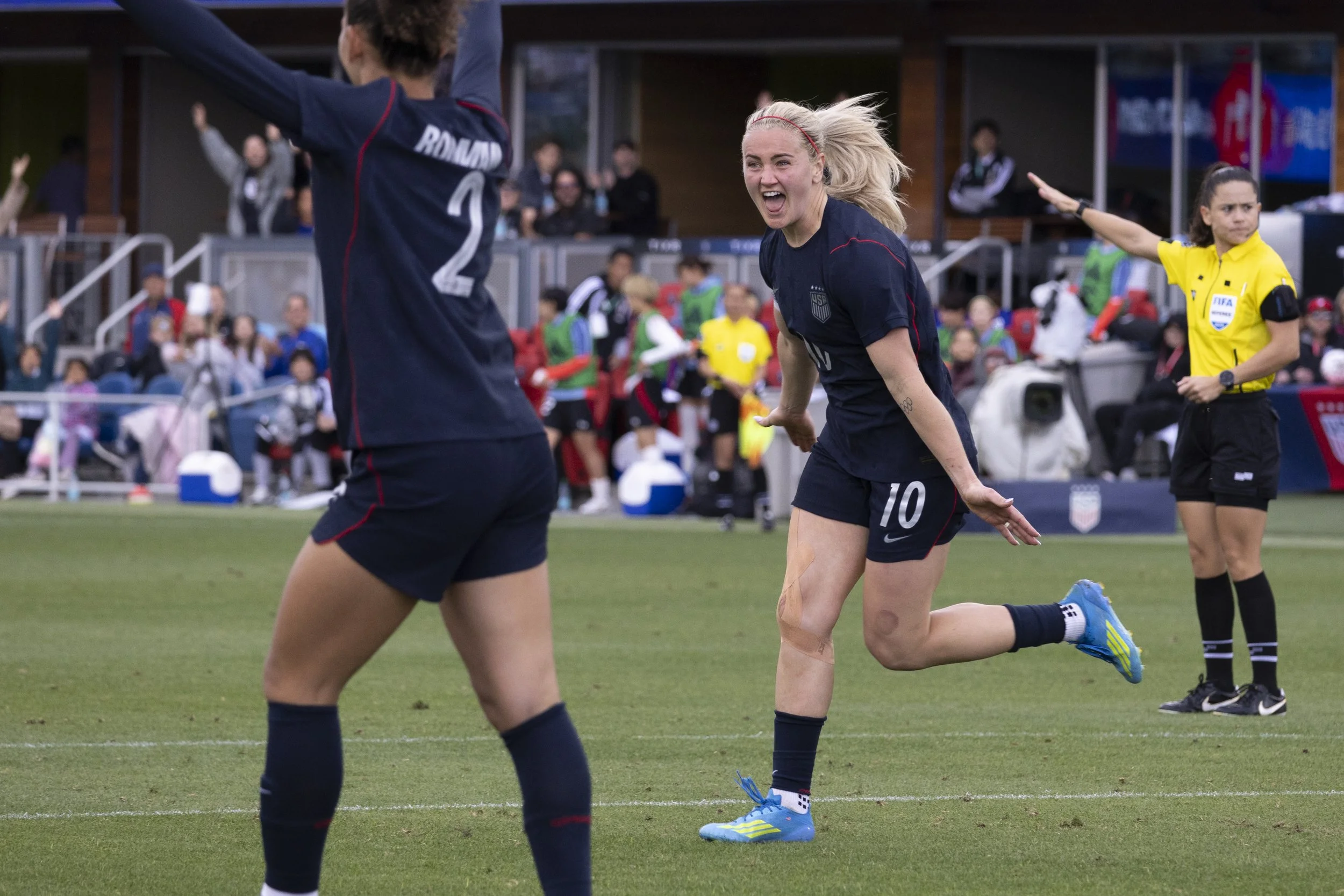 U.S. women’s national team midfielder Lindsey Heaps (10) celebrates scoring to put the U.S. up 2-1 against Japan in a friendly match at PayPal Park in San Jose on Saturday, April 11, 2026. (Nina Glick/The Santa Clara)