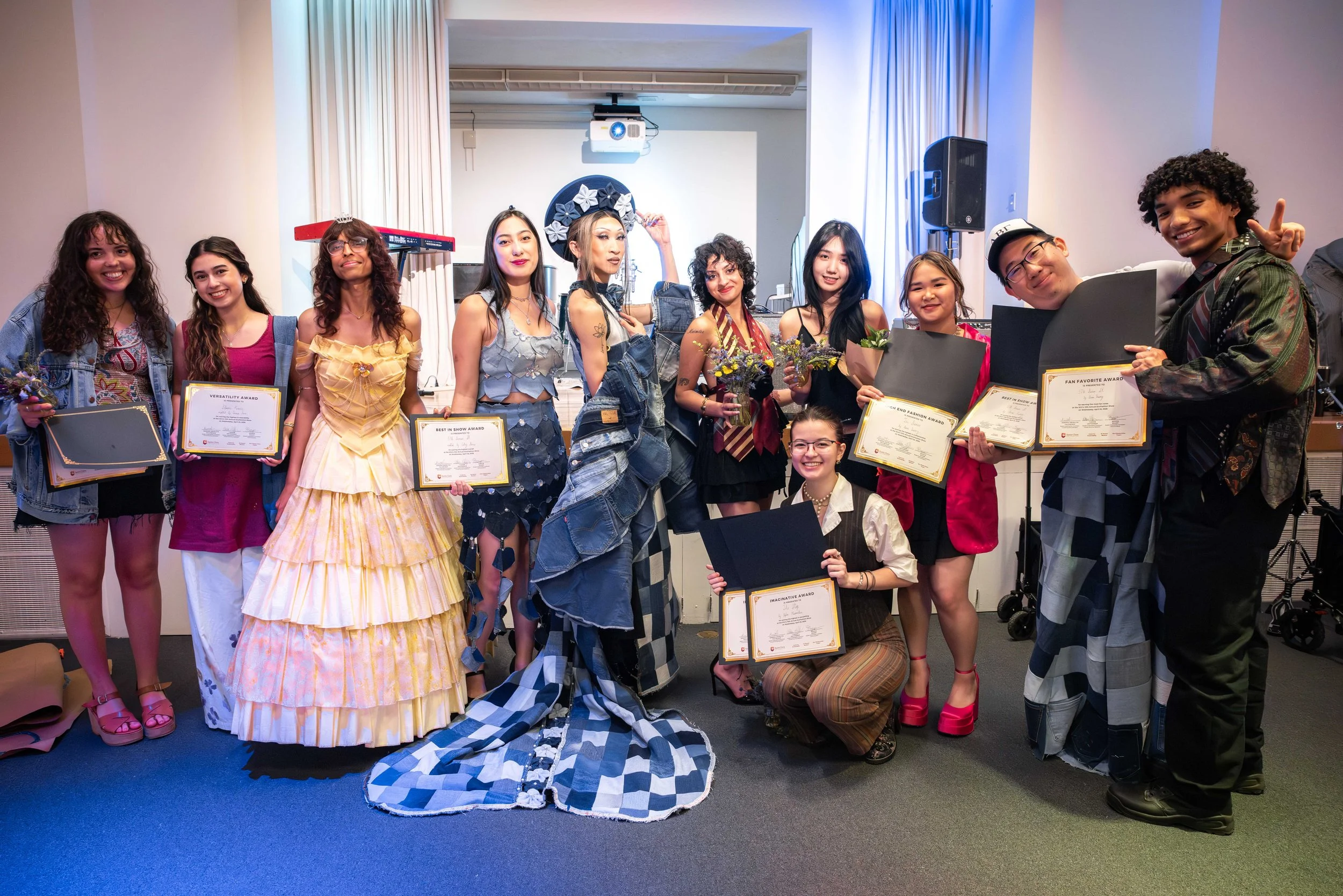 From left to right: Designer Caitlin Crowe, Model Teresa Lara, Model Maxine Rajan, Model Caley Devcr, Model Nathan Luong, Model Sierra Nathu ’27, Model Tram Lieng, Designer Dylan Masamitsu, Designer Anna Truong, Sean Tsang, and Michael Allen hold their awards. (Elaine Zhang/The Santa Clara)