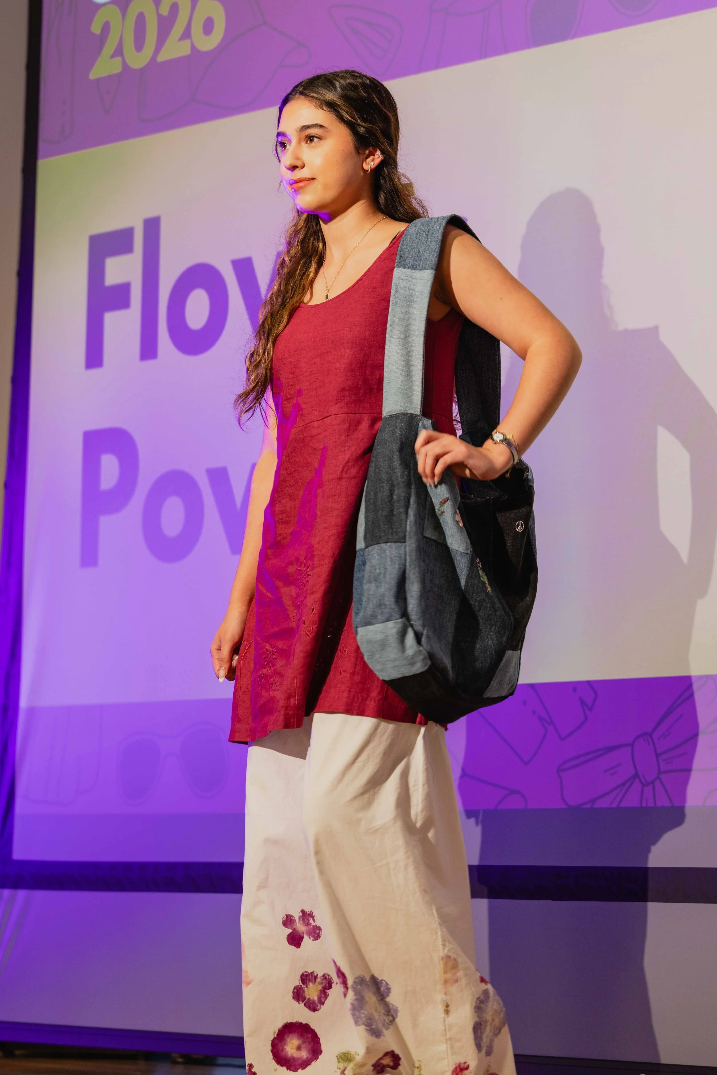 First time designer Caitlin Crowe ’28 embraced that challenge. Inspired by the Earth Day theme of the event, she created a piece representing the origins of Earth Day in the 70s using upcycled materials including a bedsheet and natural dye techniques.