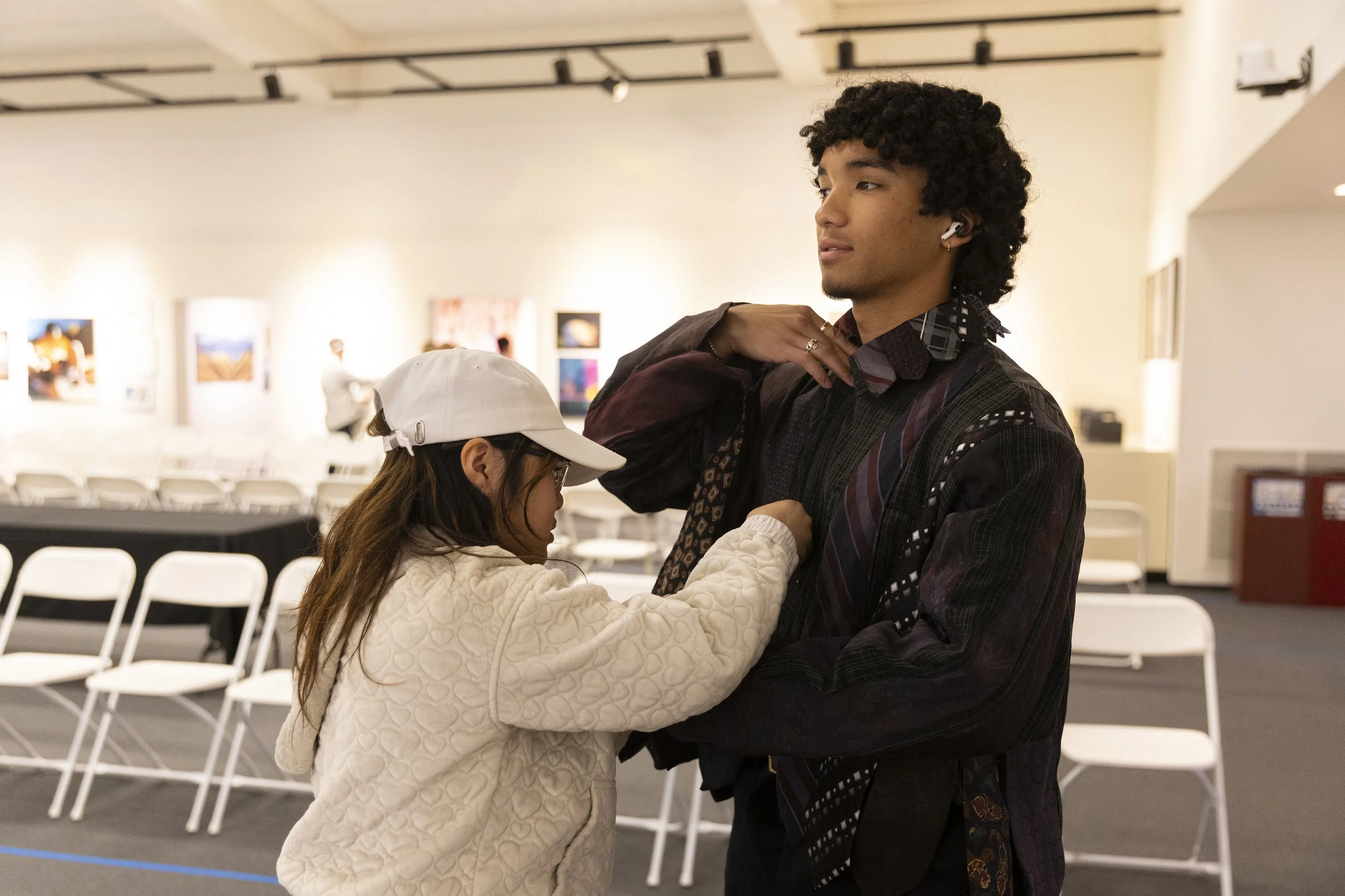 Designer Anna Truong ’26 adjusts her piece that model Michael Allen ’26 is wearing during dress rehearsal at the de Saisset Museum on Tuesday, April 21, 2026. (Nina Glick/The Santa Clara)