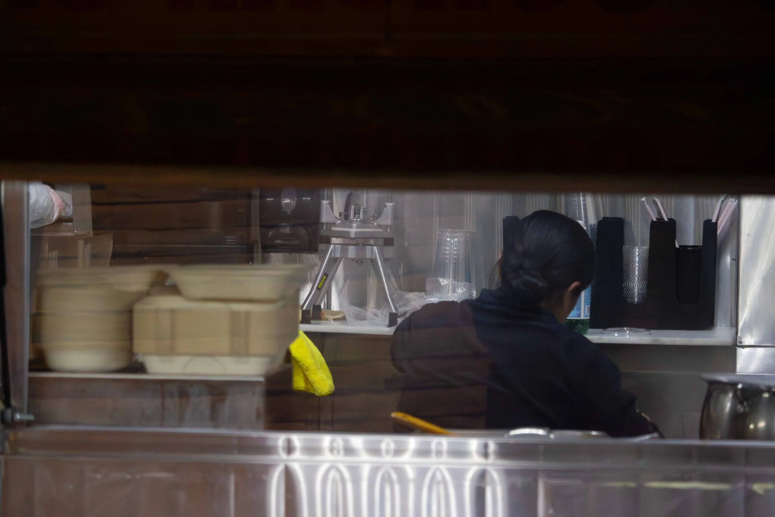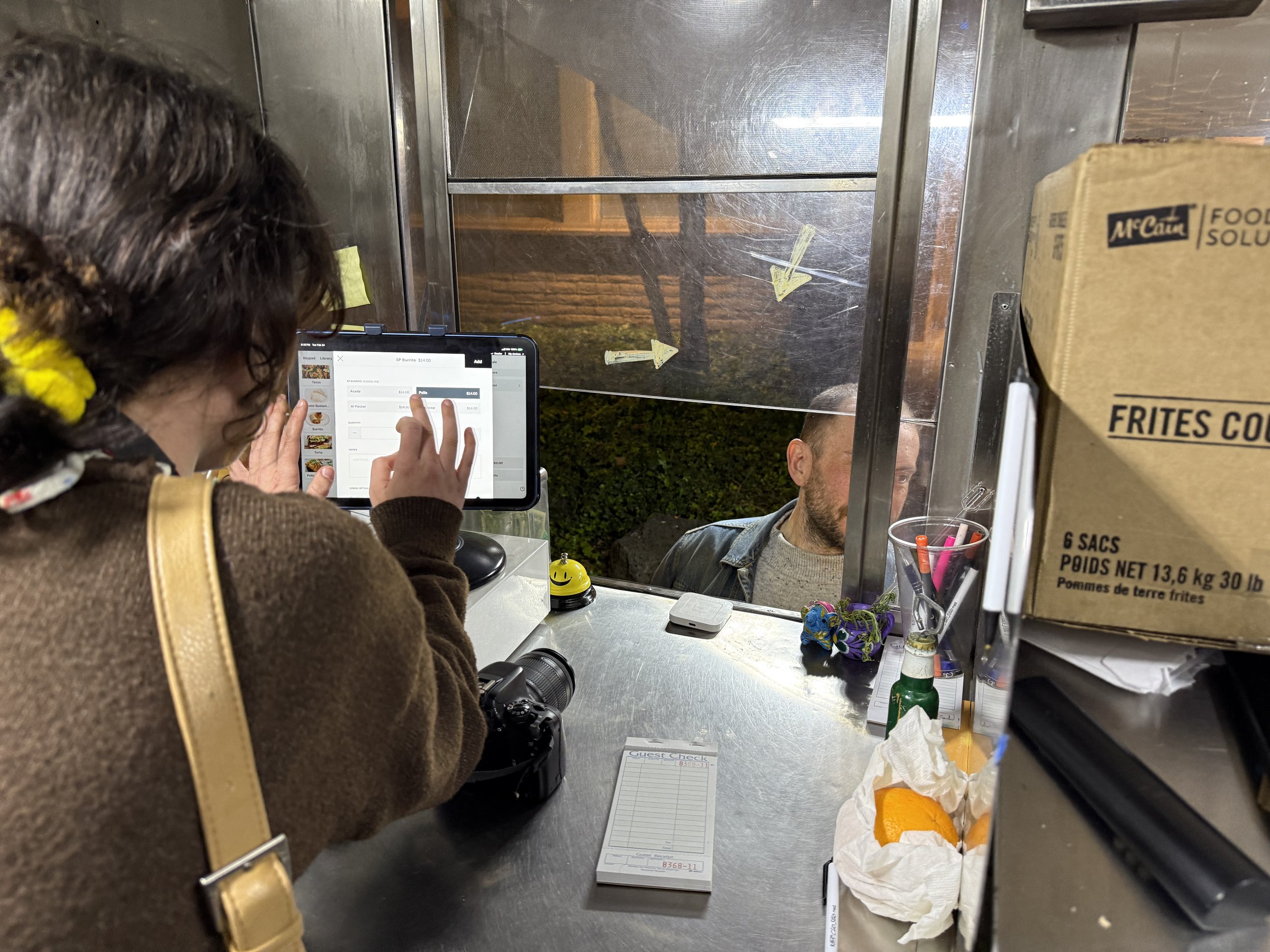 We found ourselves swallowed up by the business of the truck. Order receipts swept down the aluminum counters. Employees called back and forth to each other in Spanish, as the TV played out, commentators speaking on a recent soccer game.