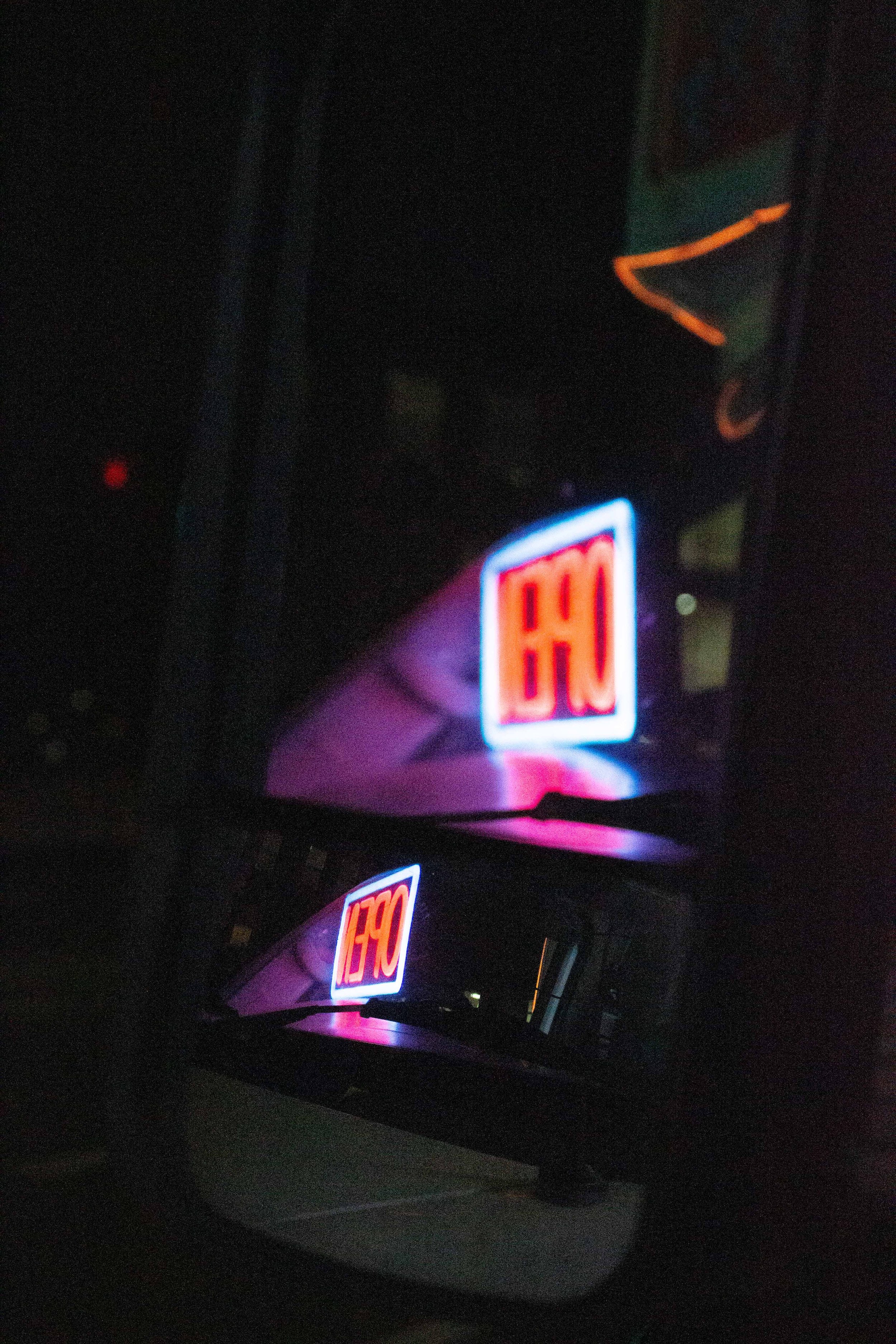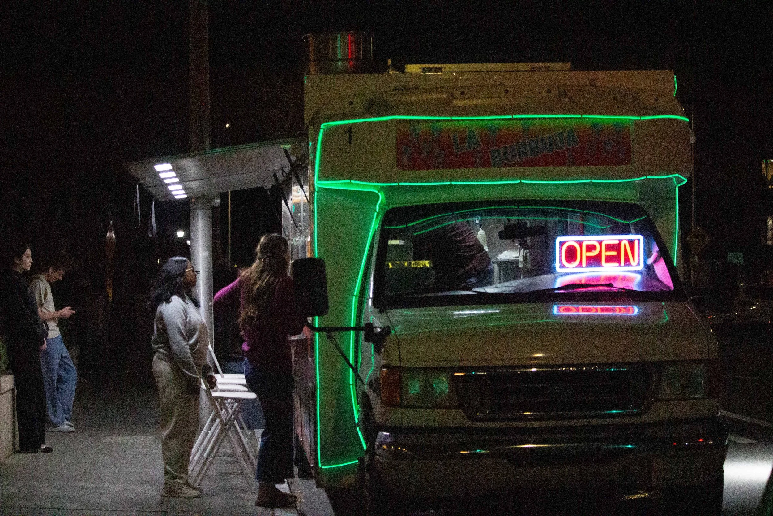 Neon Open sign reflected in food truck side mirror. (Gaia Buller for The Santa Clara)