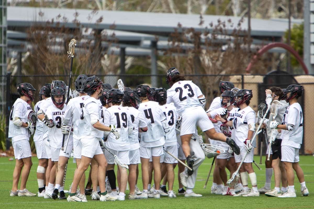 Photo by David Head. Santa Clara University men’s lacrosse team celebrates their win.