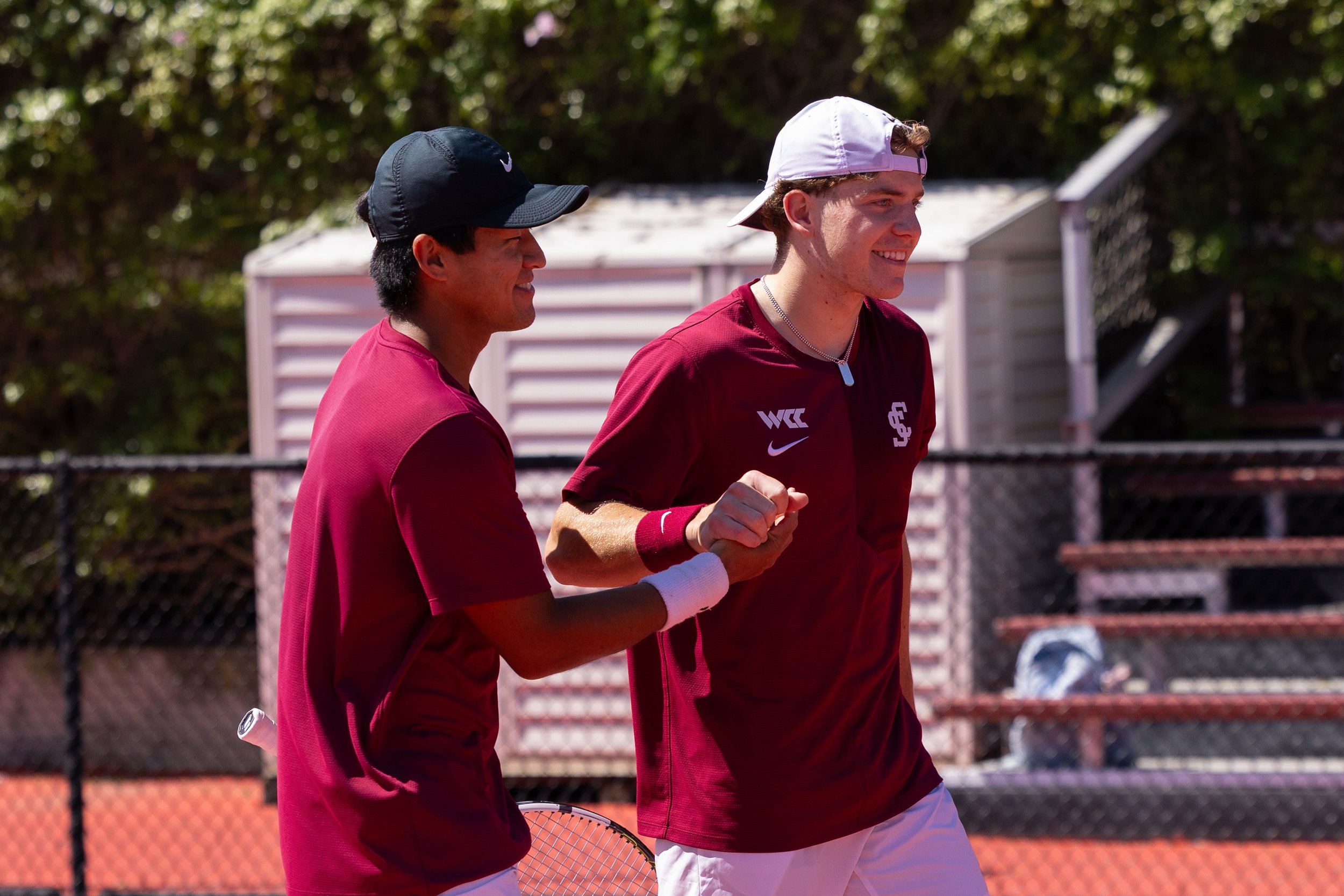 Santa Clara doubles partners Luca Bluett ’28 (right) and John Kim ’26 (left) finish a handshake after winning their doubles match against Pacific on Thursday, April 2, 2026 at Degheri Tennis Center in Santa Clara, Calif. (Nina Glick/The Santa Clara)