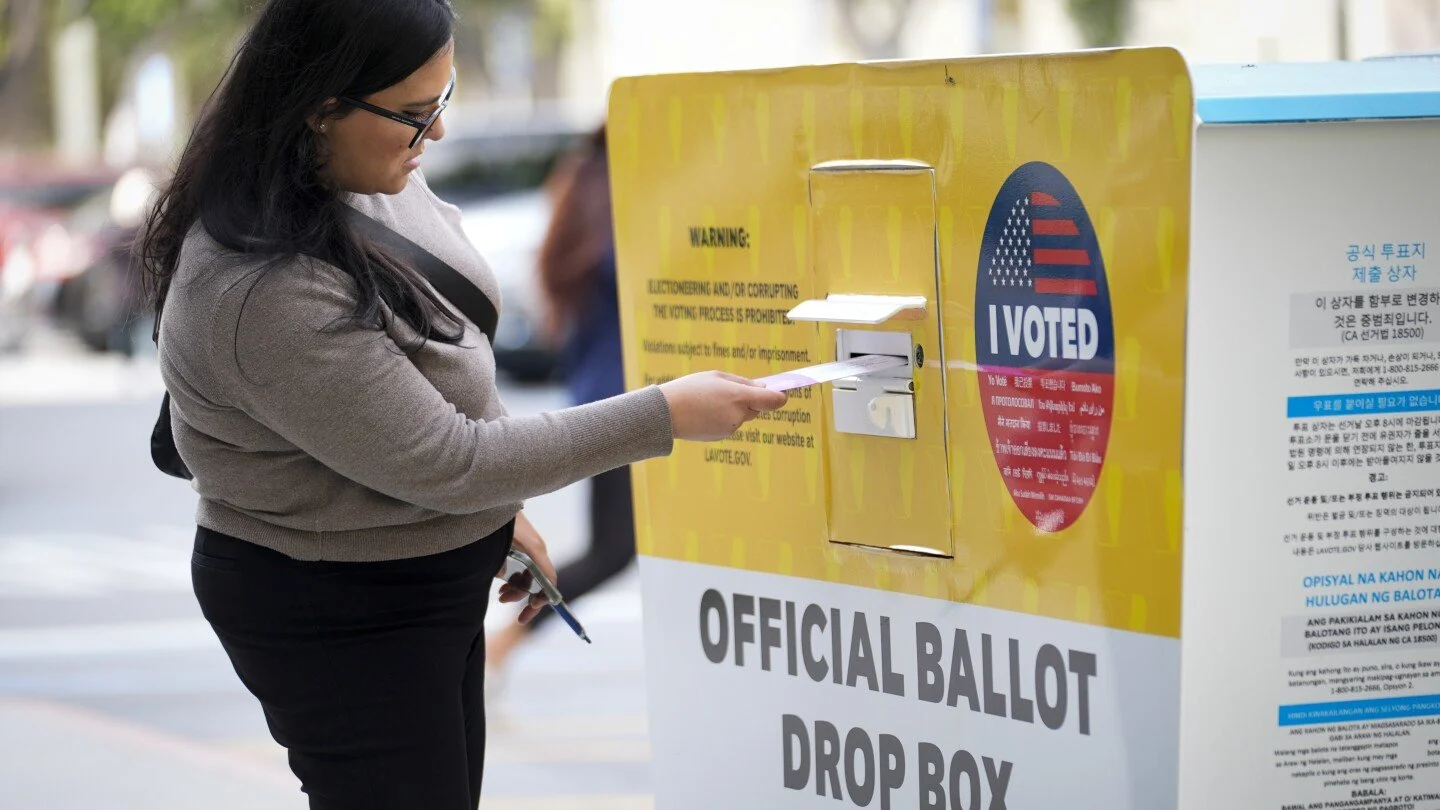 Photo provided by The Associated Press. A voter submits her ballot in a drop-off box.