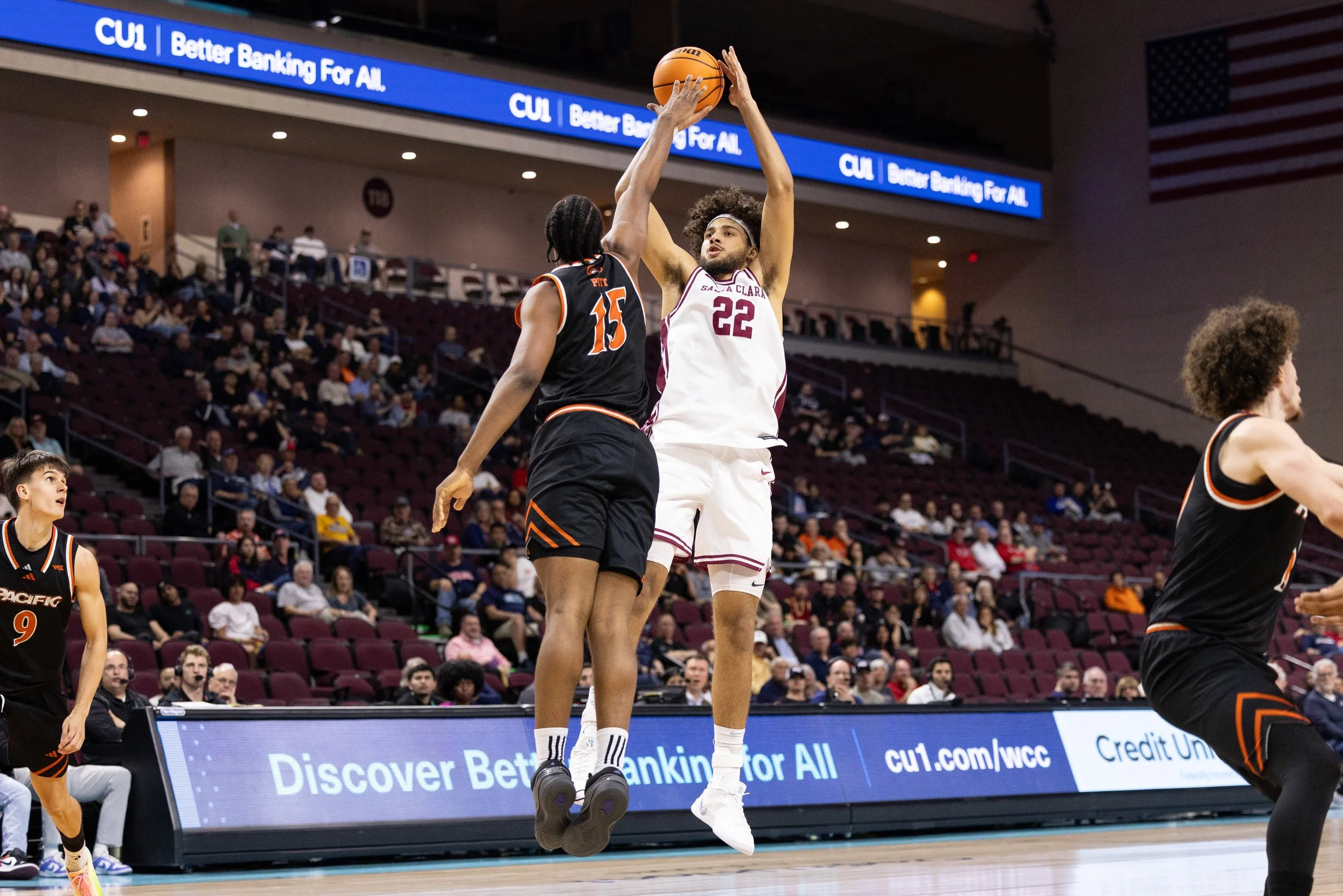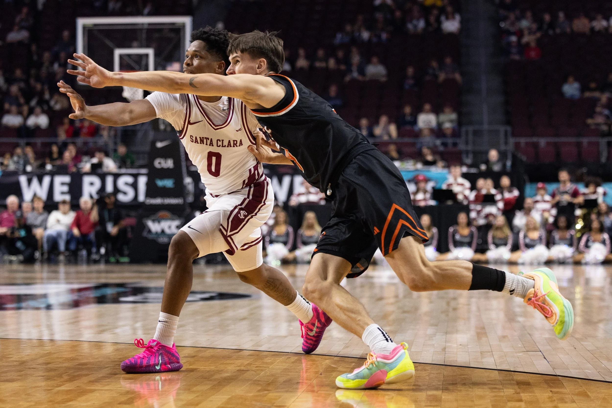 The Broncos opened the game with a dominant 7-0 run. Both teams found an offensive rhythm, trading baskets throughout the first half. Santa Clara led 45-38 at halftime after going 8-for-17 from 3-point range.
