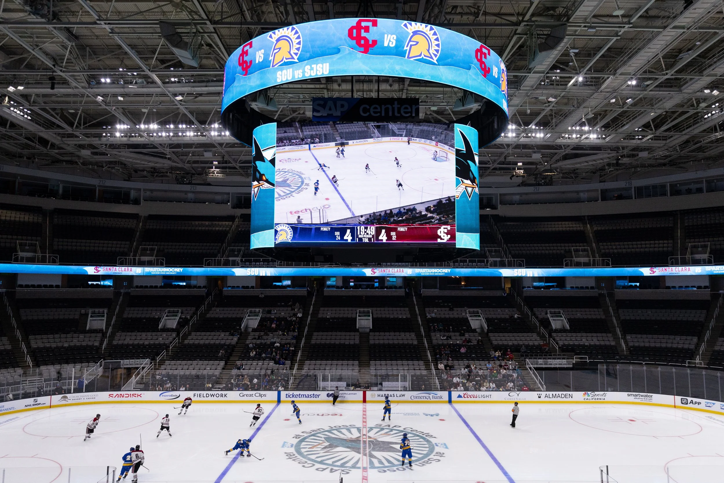 The Jumbotron and screens around the SAP Center during the game said “SCU vs SJSU” and featured the logos of both universities. (Nina Glick/The Santa Clara)