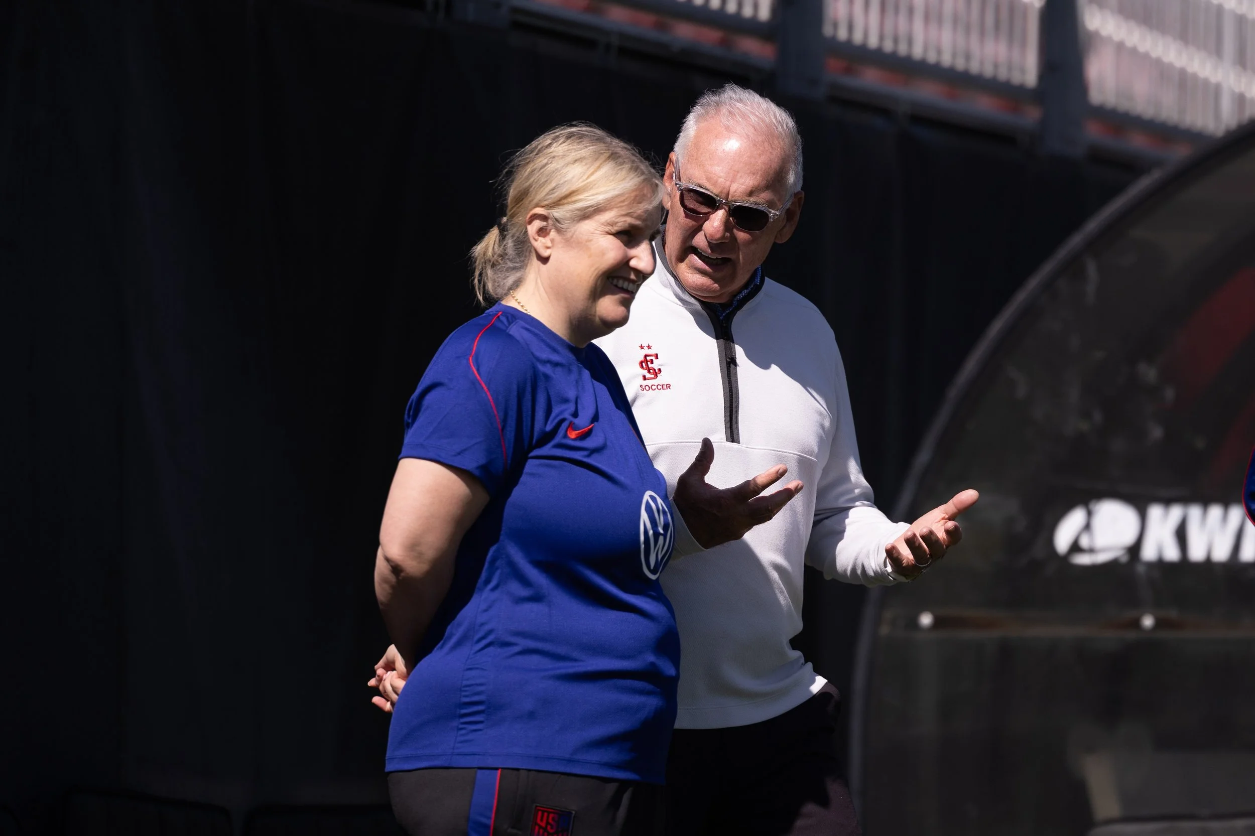 Santa Clara women’s soccer head coach Jerry Smith speaks with USWNT head coach Emma Hayes before USWNT practice at Buck Shaw Field on Wednesday, April 8, 2026. (Nina Glick/The Santa Clara)