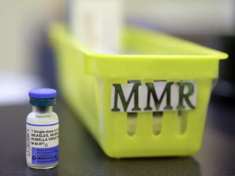 A vial of a measles, mumps and rubella vaccine sits on a countertop at a pediatrics clinic in Greenbrae, Calif., on Feb. 6, 2015. (AP Photo/Eric Risberg, File)