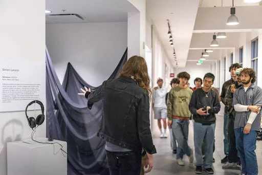 Standing across the hall from a corner carefully arranged with a plethora of audio equipment, Simon Lanzoni, in an ascot and black denim jacket, introduced his audiovisual installation Reflections. The piece features a mirror veiled by – but visible through – a gauzy shroud of black fabric as well as a spacey, ambient audio track.