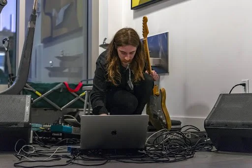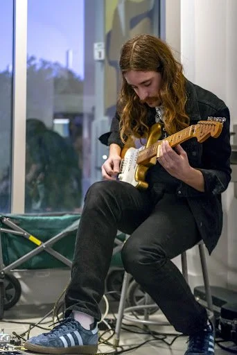 Lanzoni’s gold guitar ran through seven of the eleven pedals on his pedalboard, and then into his laptop along with a synth. The output was an introspective and ethereal resonance that filled the hallway.